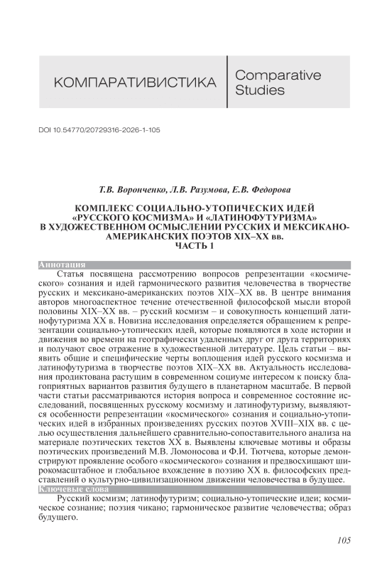 The Complex of Socio-Utopian Ideas of ‘Russian Cosmism’ and ‘Latinofuturism’ in the Literary Reflection of Russian and Mexican- American Poets of the 19th – 20th Centuries. Part 1