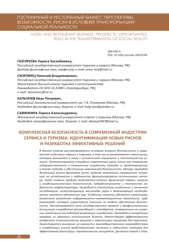 Комплексная безопасность в современной индустрии сервиса и туризма: идентификация новых рисков и разработка эффективных решений