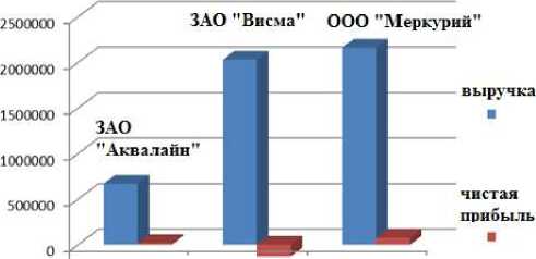 На рисунке 3 представлена диаграмма, отражающая выручку и чистую прибыль за 2015 год компаний ЗАО «Аквалайн», а также ЗАО «Висма» и ООО «Меркурий» - основных конкурентов.