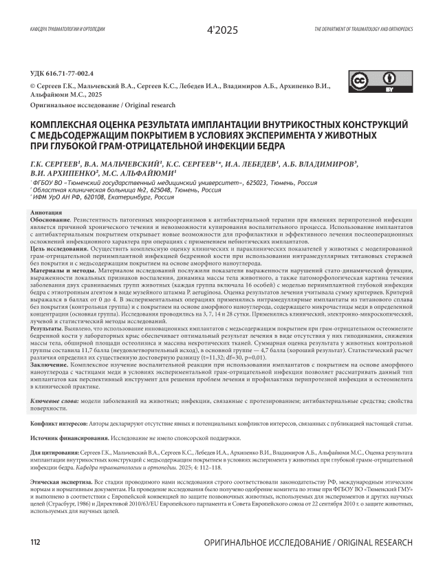 Комплексная оценка результата имплантации внутрикостных конструкций с медьсодержащим покрытием в условиях эксперимента у животных при глубокой грамм-отрицательной инфекции бедра