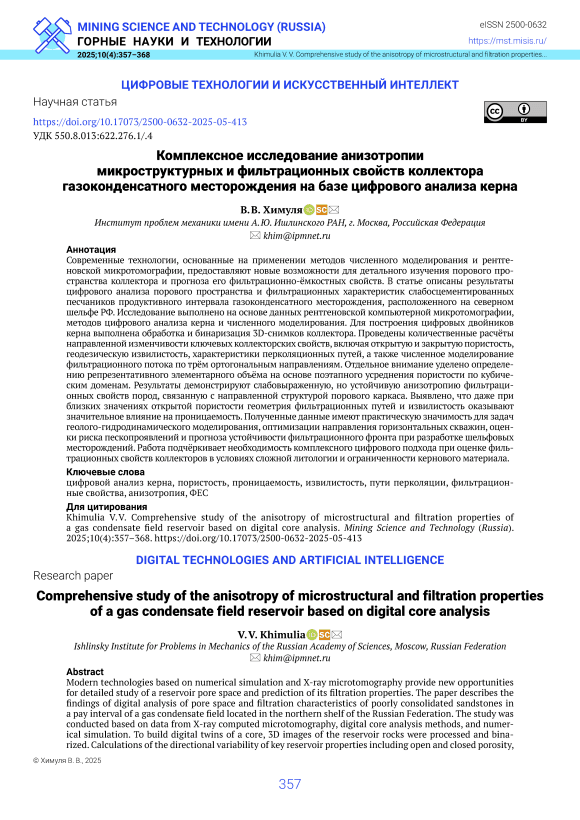 Современные технологии, основанные на применении методов численного моделирования и рентгеновской микротомографии, предоставляют новые возможности для детального изучения порового пространства коллектора и прогноза его фильтрационно-ёмкостных свойств. В статье описаны результаты цифрового анализа порового пространства и фильтрационных характеристик слабосцементированных песчаников продуктивного интервала газоконденсатного месторождения, расположенного на северном шельфе РФ. Исследование выполнено на основе данных рентгеновской компьютерной микротомографии, методов цифрового анализа керна и численного моделирования. Для построения цифровых двойников керна выполнена обработка и бинаризация 3D-снимков коллектора. Проведены количественные расчёты направленной изменчивости ключевых коллекторских свойств, включая открытую и закрытую пористость, геодезическую извилистость, характеристики перколяционных путей, а также численное моделирование фильтрационного потока по трём ортогональным направлениям. Отдельное внимание уделено определению репрезентативного элементарного объёма на основе поэтапного усреднения пористости по кубическим доменам. Результаты демонстрируют слабовыраженную, но устойчивую анизотропию фильтрационных свойств пород, связанную с направленной структурой порового каркаса. Выявлено, что даже при близких значениях открытой пористости геометрия фильтрационных путей и извилистость оказывают значительное влияние на проницаемость. Полученные данные имеют практическую значимость для задач геолого-гидродинамического моделирования, оптимизации направления горизонтальных скважин, оценки риска пескопроявлений и прогноза устойчивости фильтрационного фронта при разработке шельфовых месторождений. Работа подчёркивает необходимость комплексного цифрового подхода при оценке фильтрационных свойств коллекторов в условиях сложной литологии и ограниченности кернового материала.