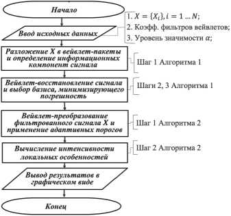 j me N И— } me N s если £\{X,TP,m)\< £ \ {x,T 2+1,m) p + E \ где множество индексов I1, l = p, 2 p, 2 p +1, m e I1, если |X [ tn ] , TP m [ tn ]| > TP-m , TIP, j,m = T« ' 6P,m ■ Шаг 2. Выполняем вейвлет-восстановление преобразованного на основе шага 1 сигнала JN F [tn ] = EEn (X [tn ] , TPm [tn ]) TP m [tn ] , j=0 m=1 где N – длина сигнала, J – наибольший масштаб. Шаг 3. По правилу 2 определяем наилучший аппроксимирующий вейвлет Tmin ■ На выходе Алгоритма имеем вектор FTmin [tn ] ■ Алгоритм адаптивной вейвлет-фильтрации сигнала (Алгоритм 2): Шаг 1. Выполняем дискретное вейвлет-преобразование сигнала FTmin [tn ] и применяем пороговые функции (величины порогов определяем по правилу 1): N F[tn ] = EEn(FTmn [tn ],Tk,n [tn])Tk,n [tn ], k n=1 П (Ftmn [tn ], Tk,n [tn ]) = = j FTmn [ tn ] , Tk, n [ tn ] , если | FTmn [ tn ] , Tk, n [ tn ]|>To, k, n I 0, если |Ftmn [tn ], Tk,n [tn ]|< Ta,k,n To,k,n = ^ * 6k,n - пороги. Полученный преобразованный сигнал F [tn ] содержит аномальные особенности. Шаг 2. Оцениваем суммарную интенсивность выделенных аномальных особенностей: K E [tn ] = ЕП(FTmn [tn ],Tk,n [tn])■ k=0 Замечание 4. Для обеспечения оперативности получения результата алгоритма и сокращения времени его выполнения в шаге 1 Алгоритма 1 использовался предварительно определённый по Правилу 2 набор вейвлет-функций (см. табл. 1). На рис. 1 представлена блок-схема предлагаемого комплексного алгоритма. Рис. 1. Схема реализации комплексного алгоритма
