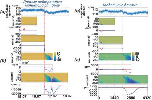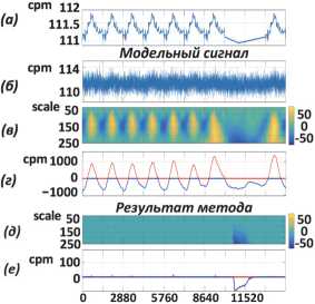 2. Результаты применения алгоритма В работе использовались природные данные вторичных космических лучей [15] и модельные данные, построенные по их подобию. Вторичные космические лучи – это частицы высоких энергий, регистрируемые наземными станциями нейтронных мониторов [15]. Аномальные изменения в потоке вторичных космических лучей свидетельствуют о возмущениях в околоземном космическом пространстве, которые способны нарушить работу систем спутниковой, навигационной и радиосвязи, а также повысить риск обострения сердечно-сосудистых заболеваний людей [7, 16]. Аномальные изменения в космических лучах могут проявляться в виде так называемых Форбуш-эффектов (внезапное локальное снижение интенсивности космических лучей) [17] и GLE-событий (сильное локальное возрастание интенсивности космических лучей, регистрируемых на поверхности Земли) [18]. На рис. 2 представлен пример дерева вейвлет-паке-тов, построенного по алгоритму определения информационных компонент сигнала. Красным цветом отмечены выбранные информационные узлы. Ниже, на рис. 2, синим цветом показан исходный сигнал, оранжевым – результат данного алгоритма. Результат подтверждает нестационарную структуру регистрируемых данных вторичных космических лучей и наличие шума. Сентябрь 2014 Рис. 2. Результат алгоритма 1 На рис. 3 показан результат обнаружения малоамплитудной продолжительной аномальной особенности (отношение сигнал / шум 1.1) в построенном модельном сигнале на фоне коррелированного шума (добавлен аддитивный розовый шум). Обнаружение выполнено на основе применения операции непрерывного вейвлет-преобразования (НВП) (рис. 3в, г) и на основе предложенного комплексного алгоритма (рис. 3 д, е). Следует отметить, что аномальная особенность в зашумленном модельном сигнале не видна (рис. 3б). Полученный результат показывает, что ввиду наличия коррелированного шума её обнаружить на основе непрерывного вейвлет-преобразования невозможно. Предложенный алгоритм позволил подавить шум и обнаружить аномальную особенность. На рис. 4 представлен пример применения комплексного алгоритма к данным нейтронного монитора ст. Оулу за 15–18 июля (слева) и модельным данным (справа), содержащим аномальную особенность. В модельный сигнал добавлялись аномальные особенности вида треугольный импульс с отношением сигнал /шум = 1,5. Момент регистрации Форбуш-эффекта в природных данных [19] и добавленная аномальная особенность в модельные данные отмечены красными пунктирными вертикальными линиями. Результаты комплексного алгоритма представлены по мере поступления данных в систему обработки. Результат алгоритма подтверждает его эффективность как для модельных, так и для природных данных. Алгоритм позволил обнаружить аномальную особенность своевременно. Рис. 3. Результаты обработки: (а) тренд+аномалия; (б) тренд+аномалия+шум; (в, г) результат применения НВП; (д, е) результат применения комплексного алгоритма Рис. 4. Результат обработки: (а) данные нейтронного монитора ст. Оулу; (б) результаты применения комплексного алгоритма к данным нейтронного монитора (обработка выполнена по мере поступления данных в систему обработки); (в) модельные данные, построенные по подобию природных; (г) результаты применения комплексного алгоритма к модельным данным (обработка выполнена по мере поступления данных в сис