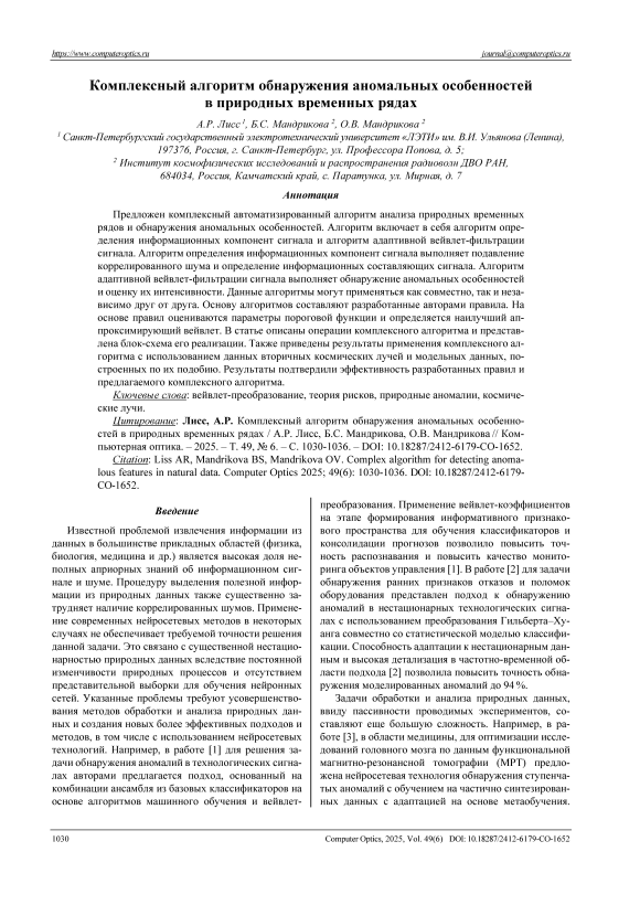 Предложен комплексный автоматизированный алгоритм анализа природных временных рядов и обнаружения аномальных особенностей. Алгоритм включает в себя алгоритм определения информационных компонент сигнала и алгоритм адаптивной вейвлет-фильтрации сигнала. Алгоритм определения информационных компонент сигнала выполняет подавление коррелированного шума и определение информационных составляющих сигнала. Алгоритм адаптивной вейвлет-фильтрации сигнала выполняет обнаружение аномальных особенностей и оценку их интенсивности. Данные алгоритмы могут применяться как совместно, так и независимо друг от друга. Основу алгоритмов составляют разработанные авторами правила. На основе правил оцениваются параметры пороговой функции и определяется наилучший аппроксимирующий вейвлет. В статье описаны операции комплексного алгоритма и представлена блок-схема его реализации. Также приведены результаты применения комплексного алгоритма с использованием данных вторичных космических лучей и модельных данных, построенных по их подобию. Результаты подтвердили эффективность разработанных правил и предлагаемого комплексного алгоритма.
