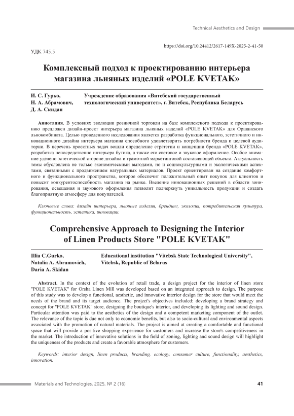 В условиях эволюции розничной торговли на базе комплексного подхода к проектированию предложен дизайн-проект интерьера магазина льняных изделий «POLE KVETAK» для Оршанского льнокомбината. Целью проведенного исследования является разработка функционального, эстетичного и инновационного дизайна интерьера магазина способного удовлетворить потребности бренда и целевой аудитории. В перечень проектных задач вошли определение стратегии и концепции бренда «POLE KVETAK», разработка непосредственно интерьера бутика, а также его световое и звуковое оформление. Особое внимание уделено эстетической стороне дизайна и грамотной маркетинговой составляющей объекта. Актуальность темы обусловлена не только экономическими выгодами, но и социокультурными и экологическими аспектами, связанными с продвижением натуральных материалов. Проект ориентирован на создание комфортного и функционального пространства, которое обеспечит положительный опыт покупок для клиентов и повысит конкурентоспособность магазина на рынке. Введение инновационных решений в области зонирования, освещения и звукового оформления позволит подчеркнуть уникальность продукции и создать благоприятную атмосферу для покупателей.