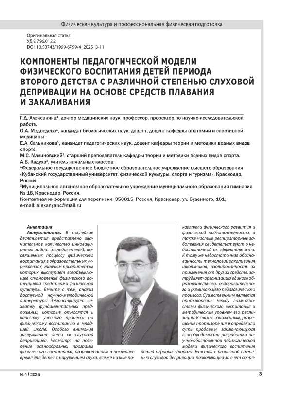 КОМПОНЕНТЫ ПЕДАГОГИЧЕСКОЙ МОДЕЛИ ФИЗИЧЕСКОГО ВОСПИТАНИЯ ДЕТЕЙ ПЕРИОДА ВТОРОГО ДЕТСТВА С РАЗЛИЧНОЙ СТЕПЕНЬЮ СЛУХОВОЙ ДЕПРИВАЦИИ НА ОСНОВЕ СРЕДСТВ ПЛАВАНИЯ И ЗАКАЛИВАНИЯ