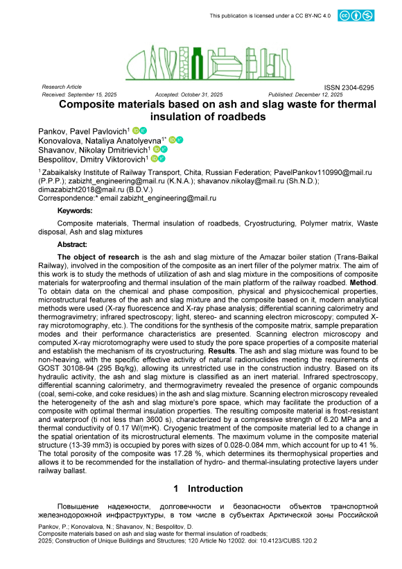 Объектом исследования является зольно-шлаковая смесь Амазарской котельной (Забайкальская железная дорога), входящая в состав композита в качестве инертного наполнителя полимерной матрицы. Целью работы является изучение способов использования зольно-шлаковой смеси в составах композитных материалов для гидроизоляции и теплоизоляции главной платформы железнодорожного полотна. Методика. Для получения данных о химико-фазовом составе, физико-физико-химических свойствах, микроструктурных особенностях зольно-шлаковой смеси и композита на ее основе использовались современные аналитические методы (рентгенофлуоресцентный и рентгенофазовый анализ; дифференциальная сканирующая калориметрия и термогравиметрия; инфракрасная спектроскопия; световая, стерео- и сканирующая электронная микроскопия; компьютерная рентгеновская микротомография и др.). Представлены условия синтеза композитной матрицы, способы подготовки образцов и их эксплуатационные характеристики. Сканирующая электронная микроскопия и компьютерная рентгеновская микротомография были использованы для изучения свойств порового пространства композитного материала и установления механизма его криоструктурирования. Результаты. Было установлено, что зольно-шлаковая смесь не вспучивается, а удельная эффективная активность природных радионуклидов соответствует требованиям ГОСТ 30 108-94 (295 Бк/кг), что позволяет использовать ее без ограничений в строительной отрасли. На основании гидравлической активности зольно-шлаковая смесь классифицируется как инертный материал. Инфракрасная спектроскопия, дифференциальная сканирующая калориметрия и термогравиметрия выявили присутствие органических соединений (угля, полукокса и остатков кокса) в зольно-шлаковой смеси. Сканирующая электронная микроскопия выявила неоднородность порового пространства зольно-шлаковой смеси, что может способствовать производству композита с оптимальными теплоизоляционными свойствами. Полученный композитный материал морозостойкий и водонепроницаемый (температура плавления не менее 3600 с), характеризуется прочностью на сжатие 6,20 МПа и теплопроводностью 0,17 Вт/(м•К). Криогенная обработка композитного материала привела к изменению пространственной ориентации его микроструктурных элементов. Максимальный объем в структуре композитного материала (13–39 мм³) занимают поры размером 0,028–0,084 мм, составляющие до 41%. Общая пористость композита составила 17,28%, что определяет его теплофизические свойства и позволяет рекомендовать его для установки гидро- и теплоизолирующих защитных слоев под железнодорожный балласт.