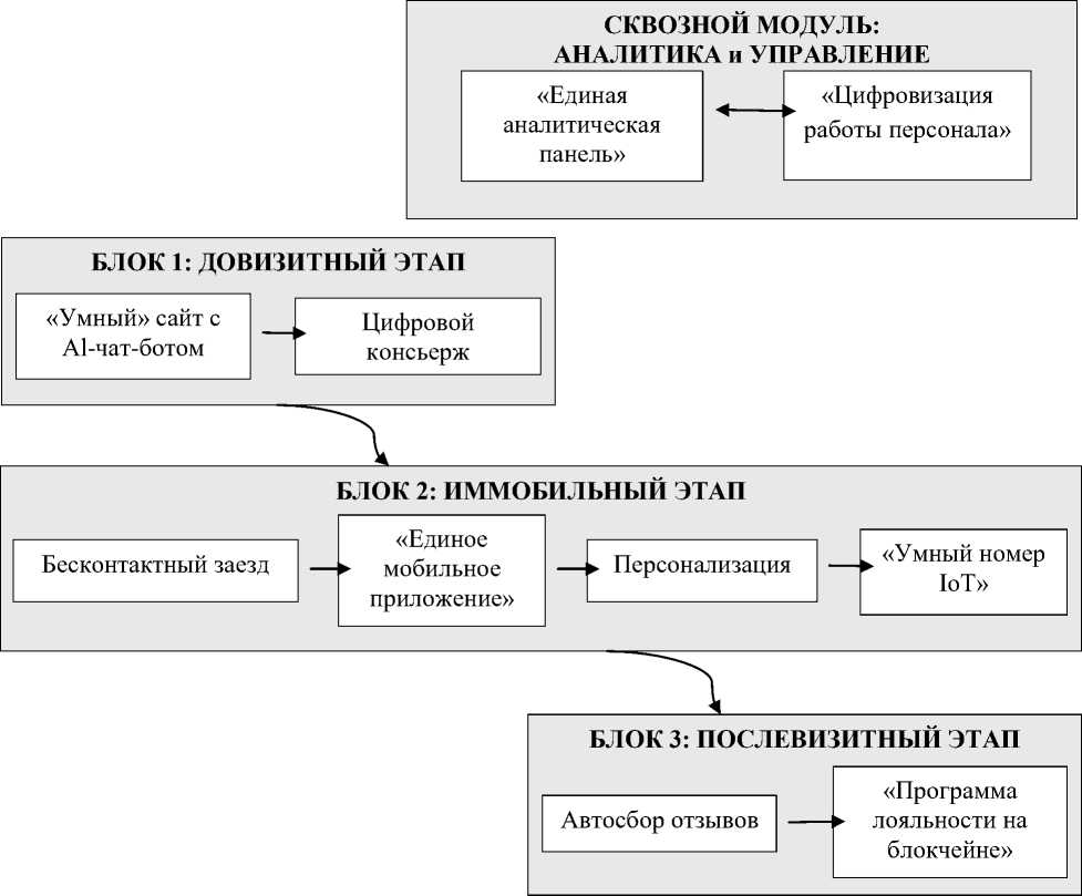 Проект цифровой экосистемы отеля может быть разбит на три ключевых блока: «Довизитный», «Иммобильный» и «Поствизитный», со сквозным модулем «Аналитики» и «Управления» (рисунок 3).
