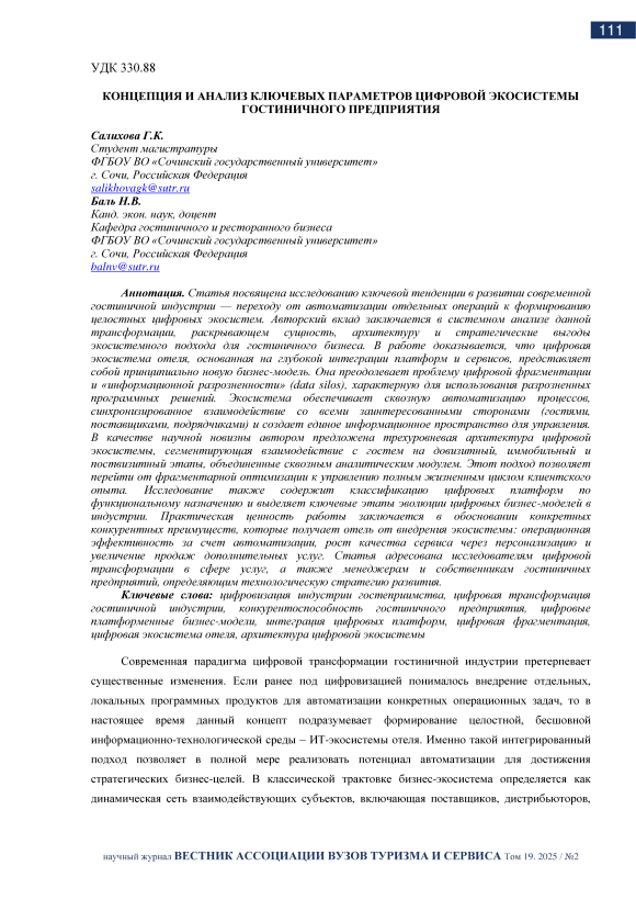 Цифровизация индустрии гостеприимства, цифровая трансформация гостиничной индустрии, конкурентоспособность гостиничного предприятия, цифровые платформенные бизнес-модели, интеграция цифровых платформ, цифровая фрагментация, цифровая экосистема отеля, архитектура цифровой экосистемы