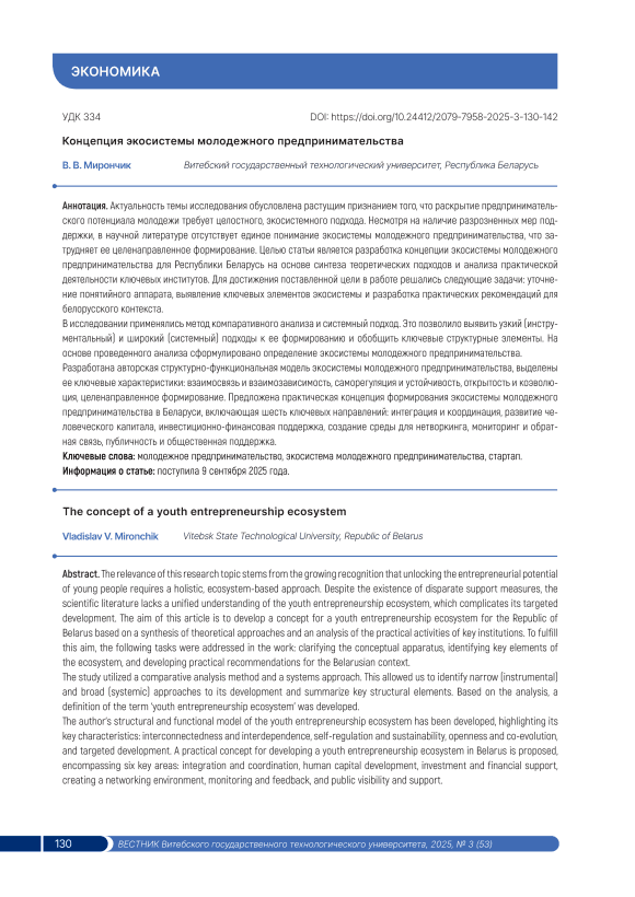 Актуальность темы исследования обусловлена растущим признанием того, что раскрытие предпринимательского потенциала молодежи требует целостного, экосистемного подхода. Несмотря на наличие разрозненных мер поддержки, в научной литературе отсутствует единое понимание экосистемы молодежного предпринимательства, что затрудняет ее целенаправленное формирование. Целью статьи является разработка концепции экосистемы молодежного предпринимательства для Республики Беларусь на основе синтеза теоретических подходов и анализа практической деятельности ключевых институтов. Для достижения поставленной цели в работе решались следующие задачи: уточнение понятийного аппарата, выявление ключевых элементов экосистемы и разработка практических рекомендаций для белорусского контекста. В исследовании применялись метод компаративного анализа и системный подход. Это позволило выявить узкий (инструментальный) и широкий (системный) подходы к ее формированию и обобщить ключевые структурные элементы. На основе проведенного анализа сформулировано определение экосистемы молодежного предпринимательства. Разработана авторская структурно-функциональная модель экосистемы молодежного предпринимательства, выделены ее ключевые характеристики: взаимосвязь и взаимозависимость, саморегуляция и устойчивость, открытость и коэволюция, целенаправленное формирование. Предложена практическая концепция формирования экосистемы молодежного предпринимательства в Беларуси, включающая шесть ключевых направлений: интеграция и координация, развитие человеческого капитала, инвестиционно-финансовая поддержка, создание среды для нетворкинга, мониторинг и обратная связь, публичность и общественная поддержка.