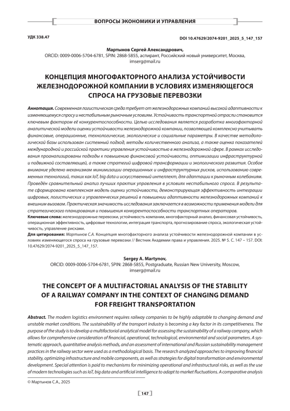 Современная логистическая среда требует от железнодорожных компаний высокой адаптивности к изменяющемуся спросу и нестабильным рыночным условиям. Устойчивость транспортной отрасли становится ключевым фактором её конкурентоспособности. Целью исследования является разработка многофакторной аналитической модели оценки устойчивости железнодорожной компании, позволяющей комплексно учитывать финансовые, операционные, технологические, экологические и социальные параметры. В качестве методологической базы использован системный подход, методы количественного анализа, а также оценка показателей международной и российской практики управления устойчивостью в железнодорожной сфере. В рамках исследования проанализированы подходы к повышению финансовой устойчивости, оптимизации инфраструктурной и подвижной составляющей, а также стратегий цифровой трансформации и экологического развития. Особое внимание уделено механизмам минимизации операционных и инфраструктурных рисков, использованию современных технологий, таких как IoT, big data и искусственный интеллект, для адаптации к рыночным колебаниям. Проведён сравнительный анализ лучших практик управления в условиях нестабильного спроса. В результате сформирована комплексная модель оценки устойчивости, демонстрирующая эффективность интеграции цифровых, логистических и управленческих решений в повышении адаптивности железнодорожных компаний к внешним вызовам. Практическая значимость исследования заключается в возможности применения модели для стратегического планирования и повышения конкурентоспособности транспортных операторов.