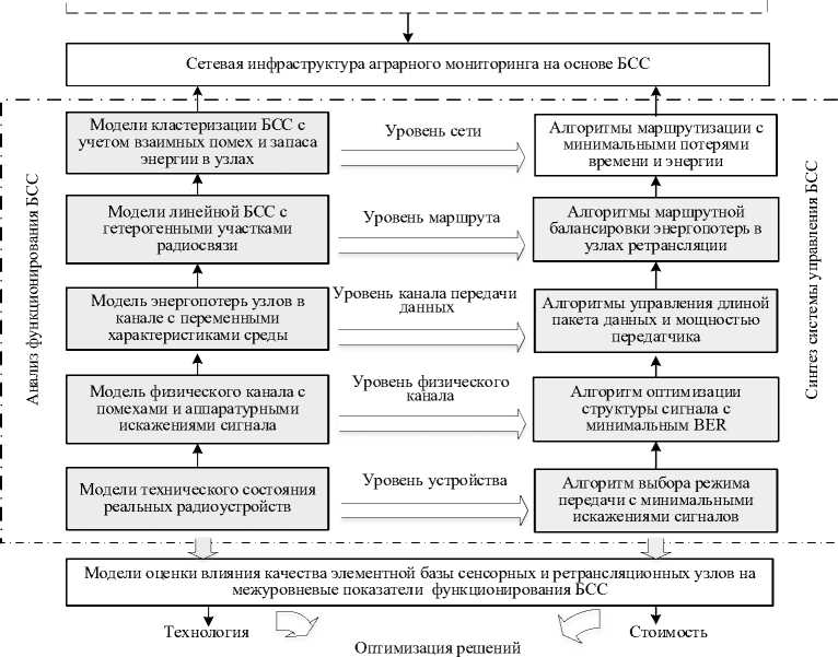 Материалы и методы. Для разработки модели были применены методы системного анализа, в т.ч. анализа и синтеза ранее известных моделей и алгоритмов управления БСС для различных уровней сетевого взаимодействия. На первом этапе рассмотрены аналитические модели каждого уровня: технического состояния радиоустройств; физического канала с помехами и аппаратурными искажениями; энергопотерь узлов в канале с переменными характеристиками среды; линейной БСС с гетерогенными участками радиосвязи и кластеризации БСС. На втором этапе произведен анализ алгоритмов управления БСС: выбора режима передачи с минимальными искажениями сигналов; оптимизации структуры сигнала с минимальным BER; управления длиной пакета данных и мощностью передатчика; маршрутной балансировки энергопотерь в узлах ретрансляции, а также маршрутизации с минимальными потерями времени и энергии. На третьем этапе произведен синтез полученных результатов, представлена иерархическая инфраструктура мониторинга агропромышленного объекта, учитывающая все уровни взаимодействия БСС, параметры сенсорных узлов и влияние внешних факторов.