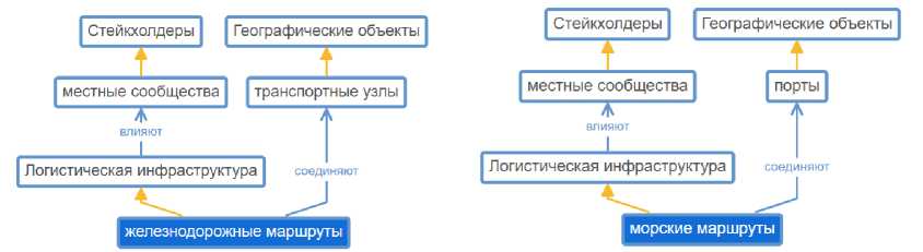 Рис. 12. Отношения индивидов логистической инфраструктуры онтологии: железнодорожные маршруты, морские маршруты (составлено авторами).