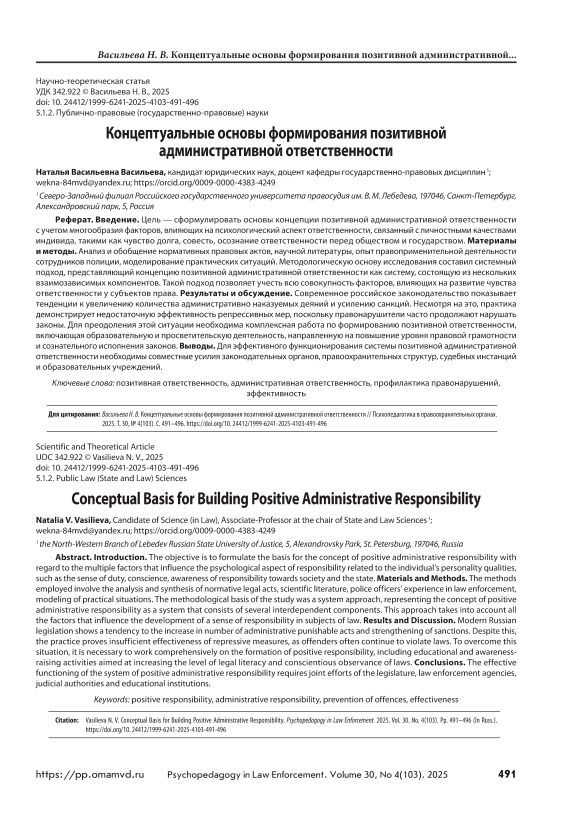 Введение. Цель — сформулировать основы концепции позитивной административной ответственности с учетом многообразия факторов, влияющих на психологический аспект ответственности, связанный с личностными качествами индивида, такими как чувство долга, совесть, осознание ответственности перед обществом и государством. Материалы и методы. Анализ и обобщение нормативных правовых актов, научной литературы, опыт правоприменительной деятельности сотрудников полиции, моделирование практических ситуаций. Методологическую основу исследования составил системный подход, представляющий концепцию позитивной административной ответственности как систему, состоящую из нескольких взаимозависимых компонентов. Такой подход позволяет учесть всю совокупность факторов, влияющих на развитие чувства ответственности у субъектов права. Результаты и обсуждение. Современное российское законодательство показывает тенденции к увеличению количества административно наказуемых деяний и усилению санкций. Несмотря на это, практика демонстрирует недостаточную эффективность репрессивных мер, поскольку правонарушители часто продолжают нарушать законы. Для преодоления этой ситуации необходима комплексная работа по формированию позитивной ответственности, включающая образовательную и просветительскую деятельность, направленную на повышение уровня правовой грамотности и сознательного исполнения законов. Выводы. Для эффективного функционирования системы позитивной административной ответственности необходимы совместные усилия законодательных органов, правоохранительных структур, судебных инстанций и образовательных учреждений.