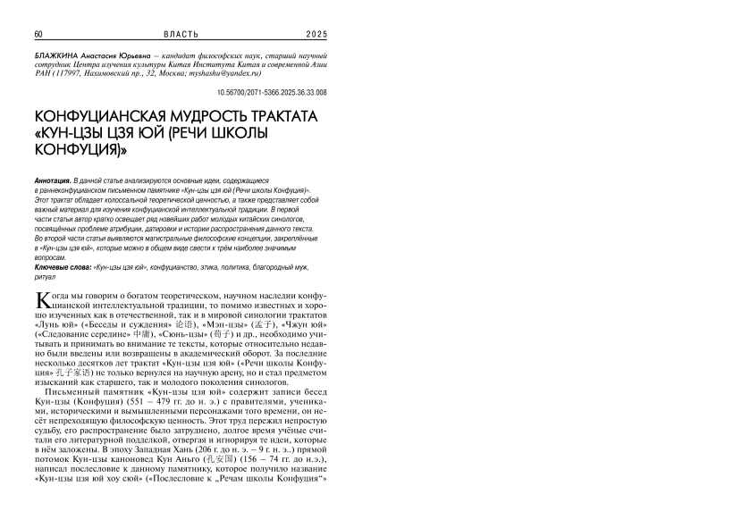 В данной статье анализируются основные идеи, содержащиеся в раннеконфуцианском письменном памятнике «Кун-цзы цзя юй (Речи школы Конфуция)». Этот трактат обладает колоссальной теоретической ценностью, а также представляет собой важный материал для изучения конфуцианской интеллектуальной традиции. В первой части статьи автор кратко освещает ряд новейших работ молодых китайских синологов, посвященных проблеме атрибуции, датировки и истории распространения данного текста. Во второй части статьи выявляются магистральные философские концепции, закрепленные в «Кун-цзы цзя юй», которые можно в общем виде свести к трем наиболее значимым вопросам.