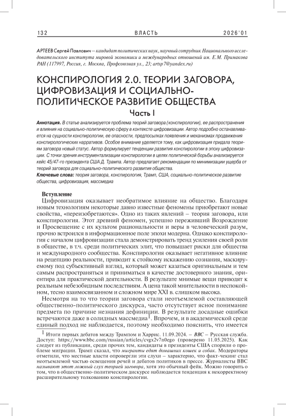 В статье анализируется проблема теории заговора (конспирологии), ее распространения и влияния на социально-политическую сферу в контексте цифровизации. Автор подробно останавливается на сущности конспирологии, ее опасности, предпосылках появления и механизмах продвижения конспирологических нарративов. Особое внимание уделяется тому, как цифровизация придала теориям заговора новый статус. Автор формулирует тенденции развития конспирологии в эпоху цифровизации. С точки зрения инструментализации конспирологии в целях политической борьбы анализируется кейс 45/47-го президента США Д. Трампа. Автор предлагает рекомендации по минимизации ущерба от теорий заговора для социально-политического развития общества.