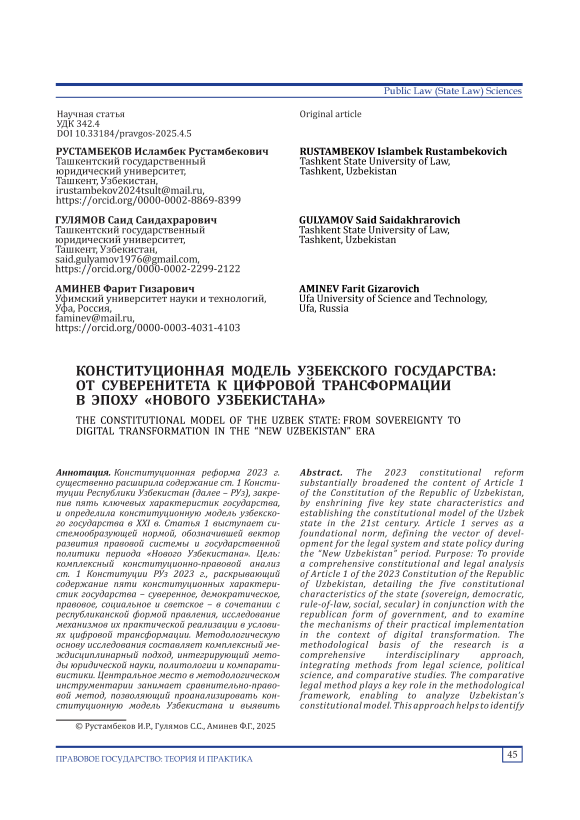 Конституционная реформа 2023 г. существенно расширила содержание ст. 1 Конституции Республики Узбекистан (далее – РУз), закрепив пять ключевых характеристик государства, и определила конституционную модель узбекского государства в XXI в. Статья 1 выступает системообразующей нормой, обозначившей вектор развития правовой системы и государственной политики периода «Нового Узбекистана». Цель: комплексный конституционно-правовой анализ ст. 1 Конституции РУз 2023 г., раскрывающий содержание пяти конституционных характеристик государства – суверенное, демократическое, правовое, социальное и светское – в сочетании с республиканской формой правления, исследование механизмов их практической реализации в условиях цифровой трансформации. Методологическую основу исследования составляет комплексный междисциплинарный подход, интегрирующий методы юридической науки, политологии и компаративистики. Центральное место в методологическом инструментарии занимает сравнительно-правовой метод, позволяющий проанализировать конституционную модель Узбекистана и выявить универсальные тренды современного конституционализма при сохранении национальной специфики. Историко-правовой метод применялся для исследования эволюции cт. 1 от редакции Конституции 1992 г. к редакции 2023 г., раскрывая динамику конституционного развития в контексте политических, экономических и социальных трансформаций периода независимости Узбекистана. Формально-юридический метод использовался для анализа нормативного содержания конституционных характеристик государства, их места в системе конституционного права и влияния на интерпретацию других конституционных норм. Методы индукции и синтеза применялись для формулирования универсальных принципов современного конституционализма, адаптируемых к национальному контексту Узбекистана. Системный анализ позволил исследовать взаимосвязь между пятью конституционными характеристиками государства и их совокупное влияние на организацию публичной власти, правовую систему и защиту прав человека. Телеологический метод использовался для выявления целей и функций конституционных норм в контексте стратегических документов развития Узбекистана, что позволило связать конституционные принципы с практической государственной политикой и оценить степень их институциональной реализации. Результаты: исследование выявило эволюцию конституционной нормы от лаконичной формулировки 1992 г. к развернутому определению 2023 г., отражающую трансформацию от постсоветского становления к зрелой государственности. Установлено соответствие ст. 1 Конституции РУз универсальным международно-правовым стандартам и целям устойчивого развития. Раскрыты институциональные механизмы реализации конституционных принципов через судебно-правовую реформу, социальные программы и цифровизацию государственного управления в контексте стратегических инициатив Президента РУз Ш.М. Мирзиёева. Обосновано, что конституционная модель Узбекистана органично сочетает приверженность универсальным принципам демократии и прав человека с национальной спецификой и способностью к адаптации в условиях вызовов XXI в.
