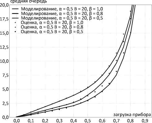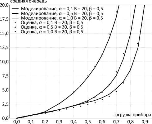 Соотношение (3) достаточно точно отражает характеристики средних значений очередей для смешанных групповых пуассоновских и детерминированных потоков (рисунок 2).