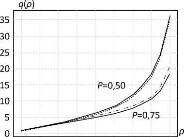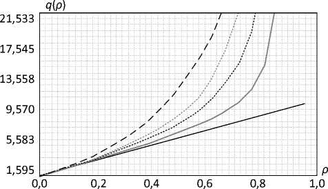 Зависимости средних размеров очередей q ( ρ ) от коэффициента загрузки ρ в случае групповых потоков с размером пачки B = 10 представлены на рисунке 1.