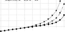 Групповые неординарные потоки, в определенной степени, представляют абстракцию реальных потоков пакетов или кадров. Пакеты имеют продолжительность по времени и могут располагаться относительно друг друга, с учетом наличия минимальных межкадровых интервалов (обычно 12 байт). Группы таких пакетов, объединенные в тандемы, образуют пачки, имеющие продолжительность по времени. Наличие тандемных групп пакетов в реальном трафике приводит к существенному уменьшению наклона графика зависимости средних значений очереди при малых значениях коэффициента загрузки. На рисунке 4 показана зависимость средних значений очередей от коэффициента загрузки для пачек пакетов, образуемых в канале UTUB 100 000-4.