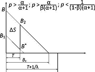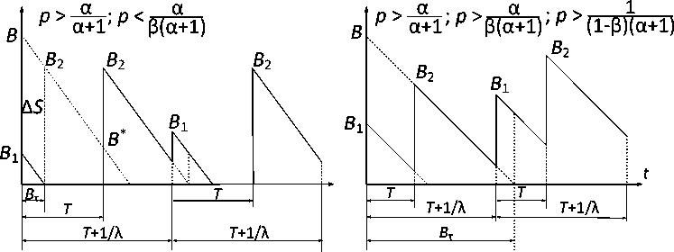 Определим «парный групповой квазипуассо-новский поток» как разновидность группового пуассоновского потока, в котором каждый интервал времени между соседними пачками увеличивается на постоянную величину T , причем по истечении этого промежутка времени формируется вторая пачка заявок. Таким образом, в пределах одного интервала происходит прибытие двух пачек размером B 1 и B 2 , при этом используются следующие обозначения: