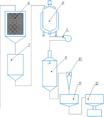 Рисунок 1. Машинно-аппаратурная схема производства экстракта черного риса: 1 – приемный бункер, 2 – весовой дозатор, 3 – водоподготовка, 4 – ультразвуковой экстрактор, 5 – насос, 6 – фильтрующее устройство, 7 – приемный бункер, 8 – вакуум-выпарной аппарат, 9 – распылительная сушилка, 10 – циклон, 11 – приемный бункер, 12 – фасовочное устройство