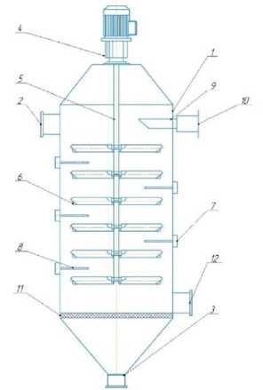 Рисунок 3. Ультразвуковой экстрактор: 1-цилиндрический корпус; 2, 3, 10, 12-технологические патрубки; 4 – приводная мешалка; 5-вал; 6 – загнутые горизонтальные лопасти; 7 – ультразвуковые генераторы; 8 – стержневые рабочие элементы; 9 – гидравлическая форсунка; 11-ложное дно Figure 3. Ultrasonic extractor: 1-cylindrical body; 2, 3, 10, 12-process nozzles; 4-drive agitator; 5-shaft; 6 – curved horizontal blades; 7 – ultrasonic generators; 8 – rod working elements; 9 – hydraulic nozzle; 11-false bottom