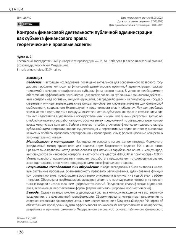 Введение. Настоящее исследование посвящено актуальной для современного правового государства проблеме контроля за финансовой деятельностью публичной администрации, рассматриваемой в качестве специфического субъекта финансового права. В условиях необходимости обеспечения эффективного, законного и целевого управления публичными финансами действенный контроль над органами, аккумулирующими, распределяющими и использующими государственные и муниципальные денежные фонды, приобретает ключевое значение для финансовой стабильности, социального благополучия и подотчетности власти обществу. Научная проблема заключается в противоречии между множественностью субъектов контроля и сохранением системных недостатков в управлении государственными и муниципальными ресурсами. Целью исследования является разработка научно обоснованных предложений по совершенствованию правовых механизмов контроля. Задачи включают в себя: уточнение финансово-правового статуса публичной администрации; анализ существующих и перспективных видов контроля; выявление ключевых проблем правового регулирования и правоприменения; формулирование конкретных законодательных новелл. Методология и материалы. Исследование основано на системном подходе. Формальноюридический метод применялся для анализа норм Бюджетного кодекса РФ и иных актов. Сравнительно-правовой метод использовался для изучения зарубежного опыта и международных стандартов финансового контроля (в частности, стандартов ИНТОСАИ и практик стран ОЭСР). Метод правового моделирования позволил разработать предложения по совершенствованию законодательства, в том числе концепцию рамочного федерального закона. Результаты исследования и их обсуждение. В ходе исследования были выявлены ключевые системные проблемы: фрагментарность правового регулирования, дублирование функций контрольных органов, преобладание формального «контроля законности» в ущерб аудиту эффективности. Обоснована необходимость смещения акцента с последующего контроля на превентивные модели с использованием цифровых технологий. Предложена классификация видов контроля, включающая перспективные формы (партисипативно-цифровой, прогностический). Выводы. Сделан вывод о том, что существующая система контроля нуждается не в экстенсивном расширении, а в качественной трансформации. Сформулированы конкретные предложения по совершенствованию законодательства, в том числе: внесение в Бюджетный кодекс РФ нормы об обязательном проведении аудита эффективности по ключевым госпрограммам и нацпроектам; разработка и принятие рамочного Федерального закона «Об основах публичного финансового контроля в Российской Федерации» для унификации понятий, принципов и механизмов координации. Подчеркивается, что предлагаемые меры позволят оптимизировать использование ресурсов контрольных органов и повысить практическую отдачу от их деятельности.