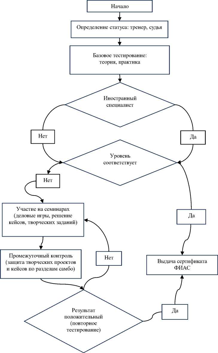 6. Если специалисту не удается успешно сдать тест, то ему предлагается посетить ближайшие тренерские семинары различного уровня (национальные, континентальные, международные), а затем после прохождения учебного курса, пройдя промежуточный контроль, который предполагает защиту творческих проектов и кейсов по различным разделам самбо, повысить свою квалификацию и получить возможность для повторного тестирования (до тех пор, пока не будет достигнут положительный результат).