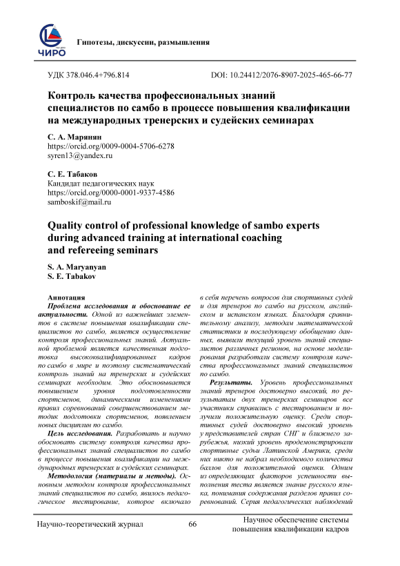 Проблема исследования и обоснование ее актуальности. Одной из важнейших элементов в системе повышения квалификации специалистов по самбо, является осуществление контроля профессиональных знаний. Актуальной проблемой является качественная подготовка высококвалифицированных кадров по самбо в мире и поэтому систематический контроль знаний на тренерских и судейских семинарах необходим. Это обосновывается повышением уровня подготовленности спортсменов, динамическими изменениями правил соревнований совершенствованием методик подготовки спортсменов, появлением новых дисциплин по самбо. Цель исследования. Разработать и научно обосновать систему контроля качества профессиональных знаний специалистов по самбо в процессе повышения квалификации на международных тренерских и судейских семинарах. Методология (материалы и методы). Основным методом контроля профессиональных знаний специалистов по самбо, явилось педагогическое тестирование, которое включало в себя перечень вопросов для спортивных судей и для тренеров по самбо на русском, английском и испанском языках. Благодаря сравнительному анализу, методам математической статистики и последующему обобщению данных, выявили текущий уровень знаний специалистов различных регионов, на основе моделирования разработали систему контроля качества профессиональных знаний специалистов по самбо. Результаты. Уровень профессиональных знаний тренеров достоверно высокий, по результатам двух тренерских семинаров все участники справились с тестированием и получили положительную оценку. Среди спортивных судей достоверно высокий уровень у представителей стран СНГ и ближнего зарубежья, низкий уровень продемонстрировали спортивные судьи Латинской Америки, среди них никто не набрал необходимого количества баллов для положительной оценки. Одним из определяющих факторов успешности выполнения теста является знание русского языка, понимания содержания разделов правил соревнований. Серия педагогических наблюдений позволили выявить позитивные и негативные факторы, влияющие на уровень профессиональных знаний специалистов по самбо. На основе моделирования разработали систему контроля качества профессиональных знаний специалистов. Научная новизна исследования состоит в разработке эффективной системы контроля качества профессиональных знаний, особенность которой определяется применением интерактивных методов обучения (деловых игр, кейс-методов) при передаче большого объема информации в сжатые сроки. Теоретическая значимость исследования состоит в разработке и реализации образовательных программ для специалистов по самбо, включающих в себя не только структуру и содержание, но и методы обучения и контроль качества знаний. Практическая значимость исследования выражается в разработанной авторской системе контроля качества профессиональных знаний специалистов по самбо. Она будет полезна при формировании профессиональных компетенций специалистов и может применяться в дальнейшей практике подготовки кадров международной федерацией самбо.