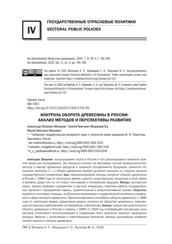 Введение: использование лесов в России и его регулирование являются важной темой для исследования. Эти процессы влияют на экономику лесной промышленности, экспорт и импорт древесных ресурсов и широкого ассортимента продукции, занятость населения, экологию и т. д. Оборот древесины требует должного контроля со стороны органов государственного управления. Цель: проанализировать методы контроля оборота древесины в России с 1990 года по настоящее время, оценить существующие тенденции в этой сфере и выявить среди них те, что станут ключевыми в ближайшем будущем. Методы: экспертный опрос, анализ правовых документов и научной литературы, практики работы государственных органов и предприятий страны, сравнительный и ретроспективный анализ. Результаты: выявлены ключевые подходы, особенности реализации государственной политики и управления в сфере контроля древесины. Проанализирована специфика оборота древесины с 1990 года по настоящее время, предложена модель контроля за оборотом древесины, отвечающая актуальным требованиям на ближайшую перспективу. Выводы: анализ методов контроля оборота древесины в России в период с 1990 по 2024 год подтверждает решающую роль методов устойчивого лесопользования в сохранении этого жизненно важного природного ресурса. Именно с устойчивым и ответственным бизнесом связано дальнейшее развитие лесной отрасли и оборота древесины.