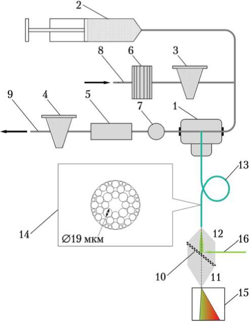 Рис. 1. Принципиальная схема рамановского газоанализатора [26]: 1 — оптическая муфта; 2 — насос; 3, 4 — краны; 5 — обратный клапан; 6 — фильтр; 7 — манометр; 8 — разъём для забора проб; 9 — разъём для выпуска проб; 10 — дихроическое зеркало; 11 и 12 — линзы с фокусными расстояниями f1 и f2 соответственно; 13 — фотоннокристаллический световод; 14 — сечение фотонно-кристаллического световода; 15 — спектрометр; 16 — лазер