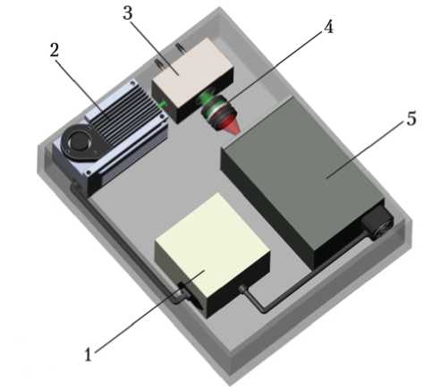 Рис. 2. Модель рамановского газоанализатора [24]: 1 — блок питания и управления; 2 — лазер; 3 — газовая кювета; 4 — оптическая система; 5 — спектрометр