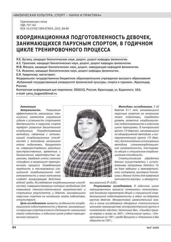 КООРДИНАЦИОННАЯ ПОДГОТОВЛЕННОСТЬ ДЕВОЧЕК, ЗАНИМАЮЩИХСЯ ПАРУСНЫМ СПОРТОМ, В ГОДИЧНОМ ЦИКЛЕ ТРЕНИРОВОЧНОГО ПРОЦЕССА