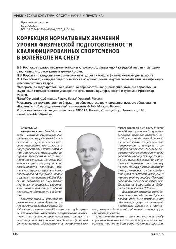 КОРРЕКЦИЯ НОРМАТИВНЫХ ЗНАЧЕНИЙ УРОВНЯ ФИЗИЧЕСКОЙ ПОДГОТОВЛЕННОСТИ КВАЛИФИЦИРОВАННЫХ СПОРТСМЕНОВ В ВОЛЕЙБОЛЕ НА СНЕГУ
