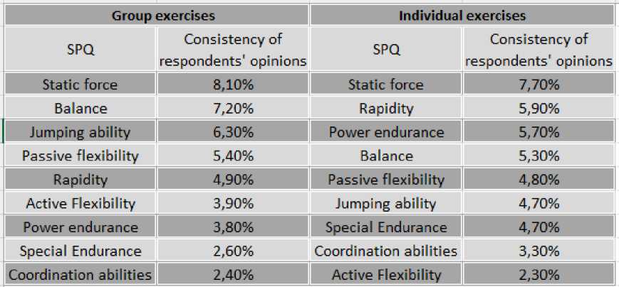 Был проведён опрос среди тренеров и квалифицированных гимнасток, специализирующихся на групповых упражнениях. Специалисты отмечают, что наиболее разительные противоречия вызывают временные форматы СФП, средства, применяемые для развития специальных физических качеств (СФК). По мнению респондентов, существуют значимые различия между структурами СФК, определяющими индивидуальные и групповые результаты спортсменок. Анализ ответов тренеров ( n 1 = 23) и квалифицированных гимнасток ( n 2 = 36) выявил ведущие специализированные качества в порядке их значимости (рис. 1).