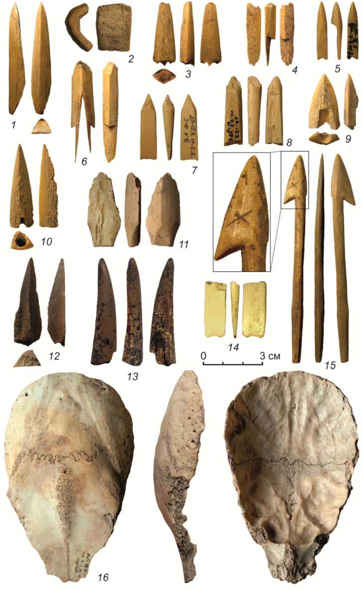 1 – a fragment of a spear or javelin tip; 2 – a fragment of the coupling; 3–12 , 14 – arrowheads; 13 – fragment of perforator; 15 – the harpoon tip; 16 – bowl
