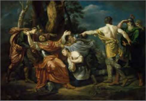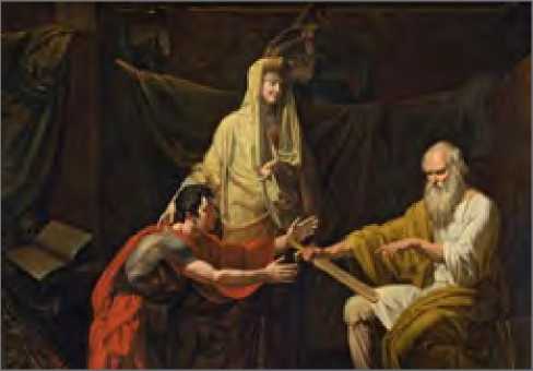 (илл. 2) О.А. Кипренский трактовал известный сюжет с «явным намерением растрогать зрителя»3. В ранней работе художника критики нашли что-то «слезливое, карамзинское»4, зная о личной склонности художника к сентиментализму, а также, вероятно, наблюдая в картине логику, согласно которой решали свои полотна художники конца XVIII в. Таковы, к примеру, картины «Владимир перед Рогнедой» (1770 г.) и «Прощание Гектора с Андромахой» (1773 г.) кисти Антона Павловича Лосенко (1737–1773 гг.), с их патетикой, театральной жестикуляцией и скульптурными позами персонажей.