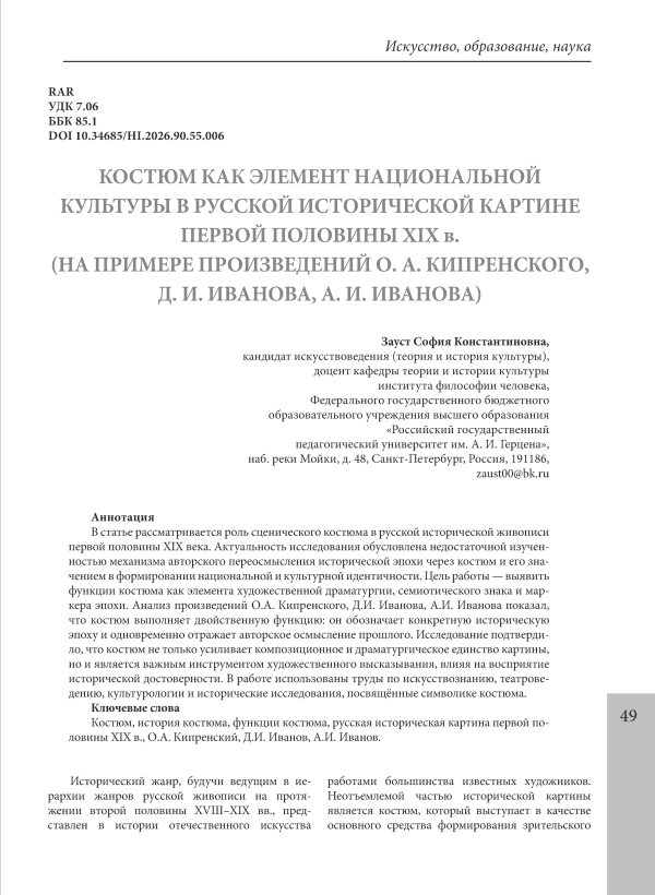 Costume as an element of national culture in the Russian historical picture of the first half of the XIX century (on the example of works by O. A. Kiprensky, D. I. Ivanov, A. I. Ivanov)