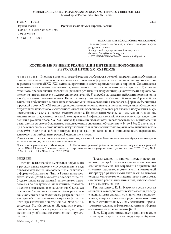 Впервые выявлены специфические особенности речевой репрезентации побуждения в виде повествовательного высказывания с глаголом в форме сослагательного наклонения в про- зе русских писателей XX–XXI веков на протяжении шести хронологических периодов. Доказывается зависимость от времени написания художественного текста следующих характеристик: 1) количе- ственного представления косвенных речевых реализаций побуждения; 2) частотности случаев со- вмещения директивного и экспрессивного значений; 3) способа выражения пейоративного значения в побудительных высказываниях. Цель статьи – установление особенностей косвенной речевой ре- ализации побуждения в виде повествовательных высказываний с глаголом в форме субъюнктива в русской прозе ХХ–XXI веков в диахроническом аспекте. Актуальность исследования обусловлена отсутствием целостного и системного описания косвенных речевых реализаций побуждения в ху- дожественном тексте в диахроническом аспекте. Использованы методы контекстуального анализа, анализа и синтеза, количественный, компаративный и филологический. Установлены следующие тен- денции в русской прозе XX–XXI веков: 1) снижение частотности повествовательных высказываний с глаголом в форме субъюнктива, используемых в значении побуждения, с 14 до 1 %; 2) актуализа- ция речевых форм с совмещением побудительного и экспрессивного пейоративного значений в текстах 1930–1970-х годов; 3) доминирующая роль фактора «социальная принадлежность персонажа», влияющего на выбор типа речевой модели писателем.