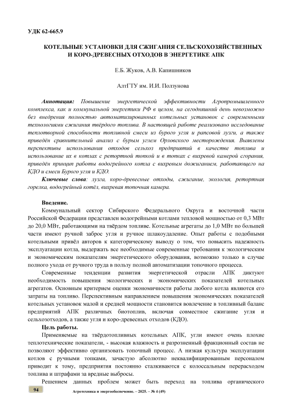 Повышение энергетической эффективности Агропромышленного комплекса, как и коммунальной энергетики РФ в целом, на сегодняшний день невозможно без внедрения полностью автоматизированных котельных установок с современными технологиями сжигания твёрдого топлива. В настоящей работе реализовано исследование теплотворной способности топливной смеси из бурого угля и рапсовой лузги, а также приведён сравнительный анализ с бурым углем Орловского месторождения. Выявлены перспективы использования отходов сельхоз предприятий в качестве топлива и использование их в котлах с ретортной топкой и в топках с вихревой камерой сгорания, приведён принцип работы водогрейного котла с вихревым дожиганием, работающего на КДО и смеси Бурого угля и КДО.