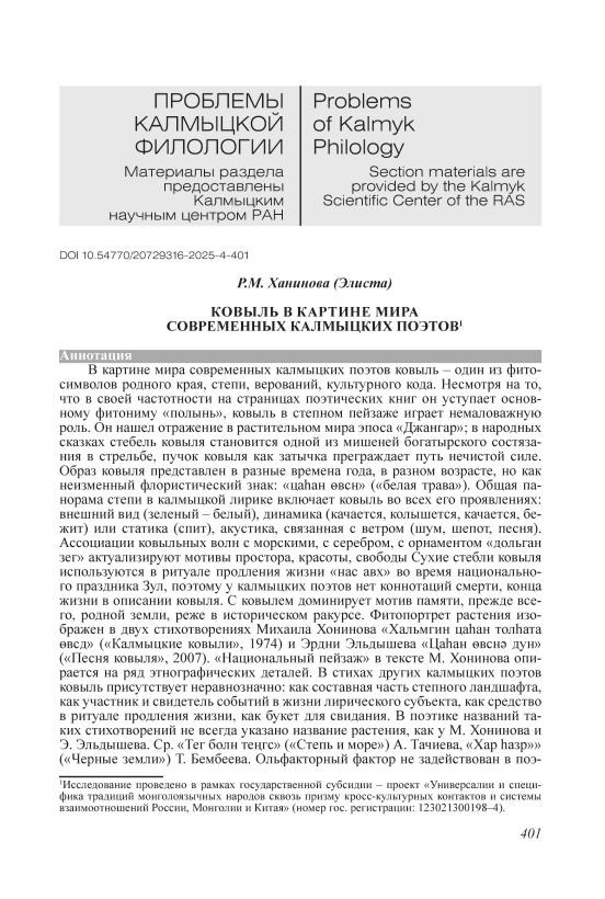 Картина мира, калмыцкая лирика, степь, ковыль, фитопортрет, память, этноботаника, поэтика