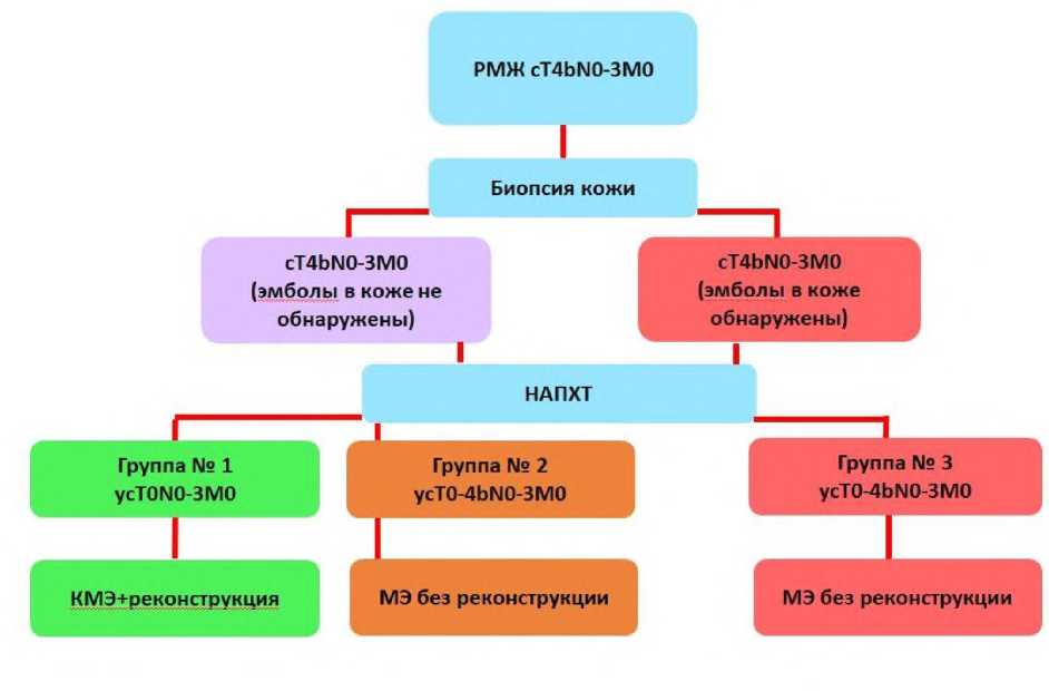 Далее общая когорта больных в зависимости от результата биопсии кожи и объема хирургического вмешательства была разделена на 3 группы: в 1-ю группу (N=7) вошли пациентки, у которых по результатам биопсии кожи не обнаружены опухолевые эмболы до проведения НАЛТ и на втором этапе лечения выполнена кожесохранная мастэктомия с одномоментной реконструкцией экспандером. Во 2‑ю группу (N=27) включены пациенты, у которых по результатам биопсии кожи также не обнаружено опухолевых эмболов до проведения НАЛТ, но после проведения лекарственного лечения не был достигнут полный/частичный клинический ответ в молочной железе, либо сохранялись симптомы отека кожи, либо пациентка не желала реконструкцию. В данной группе была проведена мастэктомия. В 3‑ю группу (N=21) включены пациенты, у которых по результатам биопсии кожи были обнаружены опухолевые эмболы до проведения НАЛТ, в связи с чем данная группа расценивалась как онкологически неблагоприятная для проведения одномоментной реконструкции, и вне зависимости от клинического ответа на лекарственное лечение им была проведена мастэктомия. Процентное соотношение одномоментных реконструктивных операций и мастэктомий составило 12,7% и 87,3% соответственно. Дизайн исследования представлен на рисунке 1.