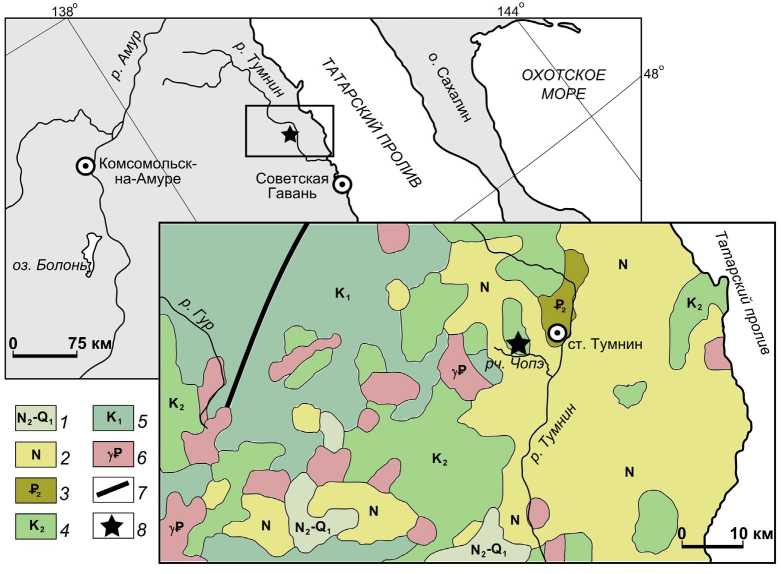 1 – Pliocene-Lower Neopleistocene; 2 – Neogene deposits; 3 – Paleogene undifferentiated deposits; 4 – Upper Cretaceous deposits; 5 – Lower Cretaceous deposits; 6 – Paleogene intrusions: granites, leucogranites, granite porphyries, granodiorites, granodiorite porphyries, granosyenite porphyries, alkaline granites; 7 – faults; 8 – Tumnin thermal water