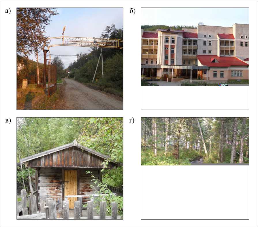 Рис. 2. Фотографии Тумнинского геотермального месторождения: а) въезд на территорию санатория; б) главный корпус санатория «Горячий ключ»; в) каптажное сооружение (скважины 8 и 9); г) ручей Чопэ