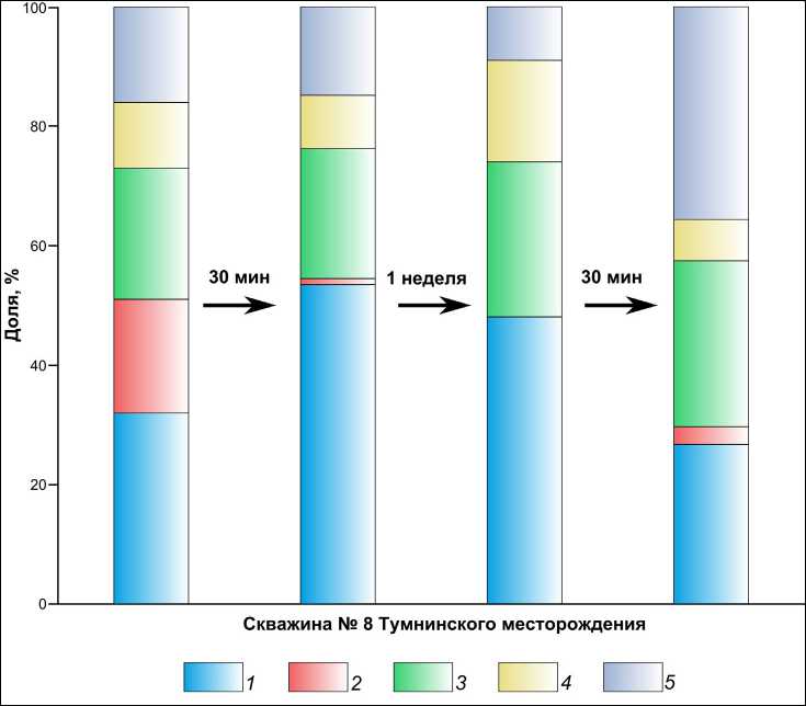 4 – nitrogen-containing compounds; 5 – terpenes ские индексы (CPI и OEP) молекулярно-массового распределения н-алканов в первой временной точке указывают на их биогенное происхождение (бактериальный генезис для низкомолекулярных гомологов и растительный генезис для высокомолекулярных гомологов). В следующих временных точках эти индексы становятся близки к единице, что может указывать на термогенное происхождение УВ (химический ре-синтез органических остатков под действием высокой температуры). Однако в последней временной точке молекулярно-массовое распределение н-алканов снова указывает на биогенный источник (табл. 2). По всей видимости, в термальных водах наблюдается два параллельных процесса производства УВ – химический ре-синтез органических остатков и биогенный механизм образования УВ, которые действуют в горячих водах постоянно с разной интенсивностью, сменяя один другой. Вероятно, с этим и связаны колебания состава алифатических