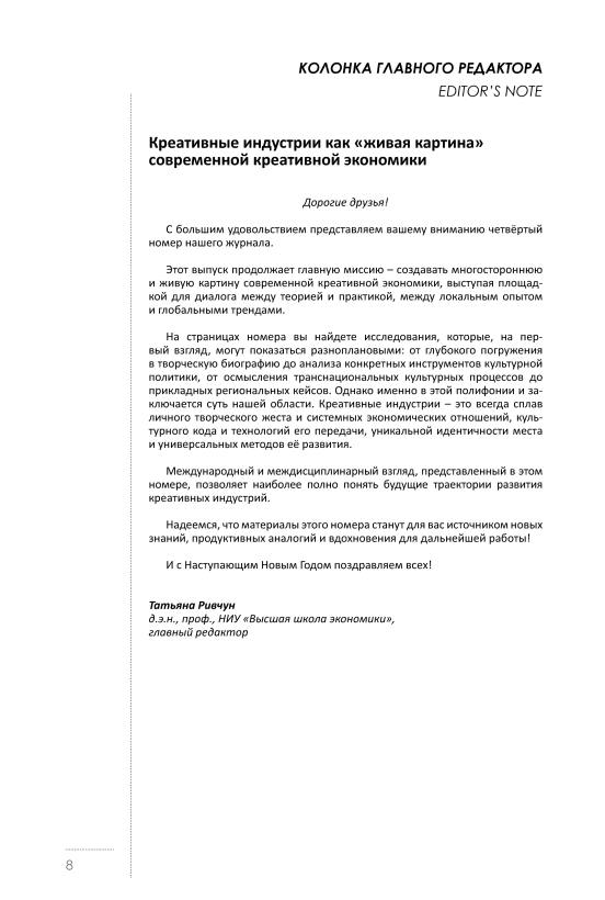 Дорогие друзья! С большим удовольствием представляем вашему вниманию четвёртый номер нашего журнала. Этот выпуск продолжает главную миссию – создавать многостороннюю и живую картину современной креативной экономики, выступая площадкой для диалога между теорией и практикой, между локальным опытом и глобальными трендами. На страницах номера вы найдете исследования, которые, на первый взгляд, могут показаться разноплановыми: от глубокого погружения в творческую биографию до анализа конкретных инструментов культурной политики, от осмысления транснациональных культурных процессов до прикладных региональных кейсов. Однако именно в этой полифонии и заключается суть нашей области. Креативные индустрии – это всегда сплав личного творческого жеста и системных экономических отношений, культурного кода и технологий его передачи, уникальной идентичности места и универсальных методов её развития. Международный и междисциплинарный взгляд, представленный в этом номере, позволяет наиболее полно понять будущие траектории развития креативных индустрий. Надеемся, что материалы этого номера станут для вас источником новых знаний, продуктивных аналогий и вдохновения для дальнейшей работы! И с наступающим Новым Годом поздравляем всех!
