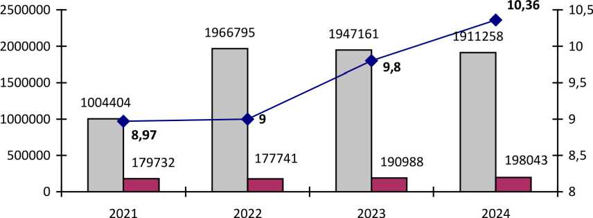 Диаграмма 1. Количество и удельный вес наркопреступлений в общем числе зарегистрированных преступлений в Российской Федерации в 2021-2024 гг.