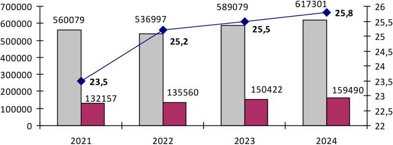 Диаграмма 4. Количество и удельный вес преступлений, связанных со сбытом наркотиков, совершенных в составе группы, в общем числе зарегистрированных преступлений данной категории в Российской Федерации в 2021-2024 гг.