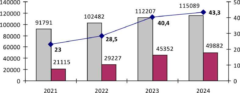 Диаграмма 3. Количество и удельный вес преступлений, связанных со сбытом наркотиков, относящихся к категории тяжких и особо тяжких, в общем числе зарегистрированных преступлений данных категорий в Российской Федерации в 2021-2024 гг.
